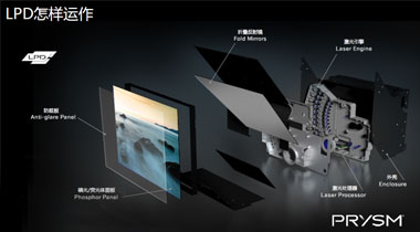 Laser Phosphor Display (LPD)激光荧光体显示技术是具有前瞻性,十分超前的专业显示技术,它不同于传统的液晶显示单元、等离子窄边以及DLP拼墙,是一种以以激光作为光源的新一代显示技术。该技术由溥美公司自主研发,通过光源、处理器以及显示技术的全面改进,弥补了传统显示技术的不足,增强了拼接显示亮度与色彩,该技术得到业内人士的一直好评,并且有望成为下一代主流显示技术之一。