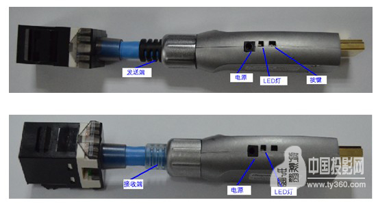 【中国投影网资讯】锐华光电公司的这款迷你HDMI单网线传输器使用一对灵活的线缆传输器(参见下图,左图为信号发送端,连接播放源; 右图为信号接收端,连接显示设备)。另加一条60米优质网线完成HDMI高清信号无压缩、零延迟的信号传输,无需HDMI铜缆。