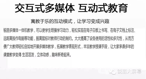 从液晶式电子白板在教育领域的应用前景,伴随着互动多媒体技术融合技术的进一步发展,大尺寸(有98寸、84寸、70寸等等)及高端新品的不断升级和创新,促使触摸一体机产品开拓应用新领域不断拓展与扩大,从现在市场应用前景来看互动触摸一体机在商务领域、大型展会、主题活动中都得到了较为广泛和普遍的使用。这意味着触摸一体机不仅局限于教育市场,同时向商务市场及高端市场进军。(更多资讯可登陆锐丽官网:www.锐丽商城.com)