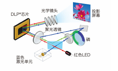 将红(高亮度红色LED)、绿(蓝色激光通过荧光体转换为绿色)、蓝(蓝色激光)三色,通过DLP®芯片投影,通过加入激光,从而打破了以往LED技术瓶颈,跨过了低流明度的鸿沟,做到了不使用高压水银灯泡而实现高亮度投影。