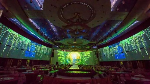 嘉兴某酒店考虑到全息4D宴会厅不仅要保证清晰绚丽的呈现效果,还要满足客人们多样的个性化定制需求。酒店采用的20台爱普生CB-G7100工程投影机可以进行360°安装,实现多角度投影的同时而不损失图像亮度;再搭配步进式电机调节电动镜头,不仅让安装投影机的位置变得更灵活,也让使用者在进行边缘融合和叠加等操作时,可以更精确地调整画面;轻松实现原始森林、海底世界、浪漫花海等各种场景的切换,满足客人们定制化、多变性的需求。