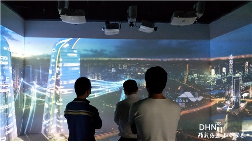 根据客户的要求,我司给出左地右墙长4M、高3M的平面设计方案,搭配6000流明工程投影机,投射画面不仅色彩度鲜明且不失层次感;选用两台DHN-DX432、一台DHN-DW705纯硬件融合器,多台DHN系列硬件融合串接实现多通道更宽画面,墙、地无压缩融合。