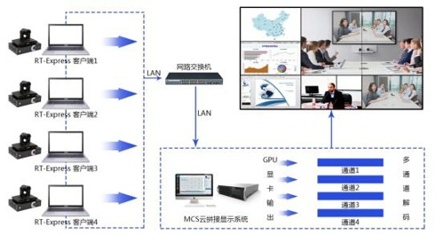 重要领导参与的视频会议与会商协作,MCwall轻松实现。RT-express迅屏功能可将笔记本电脑、平板等设备与视频会议系统完美结合,采集基地中分别位于不同房间的8路信号建立实时视频会议