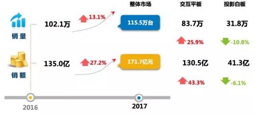 从2017年上半年数据和第三季度数据来看,中国IWB市场整体形势看好。其中,交互智能平板作为IWB市场主要拉动力,销量同比上涨25.9%,继续呈良好的发展态势。而投影白板仍维持下降趋势,销量同比下降10.8%。报告预测,交互智能平板将维持稳定增幅。