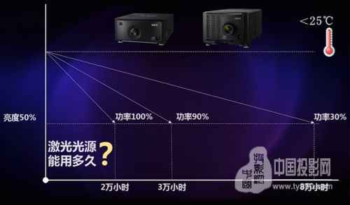 这里不得不说一下激光光源的发光原理:激光是由一个个半导体激光器通电激发产生,激光器具有热敏特性,正常使用寿命为2万小时,而高温会影响激光器的稳定性和使用寿命。激光放映机输出功率的大小是通过激光器驱动电流的改变来实现,当驱动电流升高(即提高输出功率)时,激光器工作温度随之升高,长此以往,就会加速激光器的老化;反之,降低输出功率,则激光器工作温度降低,使用时间得到延长。因此,不同功率造成工作温度不同,进而影响激光光源的使用寿命。