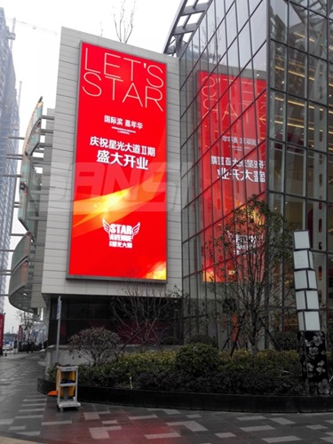 上海三思为星光大道二期配套打造了两块户外全彩LED显示屏,分别位于商城两侧高处外墙,点间距:16mm,显示面积:210平方米。