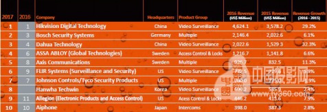 “2017全球安防50强”榜单公布 大华股份跃升至世界前三