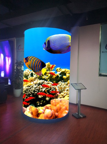更值得一提的是展厅中五彩缤纷的异形屏。会客区一侧,中间的弧形屏与两侧的多边形异形屏相得益彰;展厅中间,柱形屏和方形屏气势磅礴,让整个展厅熠熠生辉。各种LED创意异形屏千姿百态,以其独特的产品造型和特有的定制化、个性化,为客户带来不一样的显示体验。