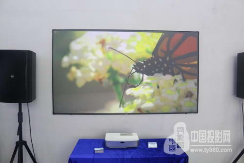 从现场图片可见,即使DET-C6投射到白墙上,效果也非常显著哦!DET-C分辨率达1080P,画质优,超短焦也节约客厅空间。