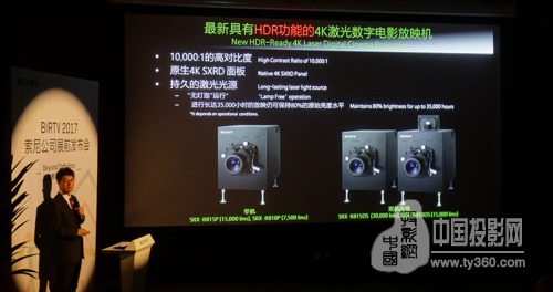 在1号馆,索尼设置了电影放映机展区,展出SRX-R815P 4K HDR激光电影放映系统,以60P帧率放映4K HDR片花。