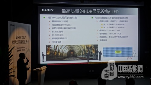 位于展台一侧的CLED黑彩晶大屏幕显示系统是此次展会的重点,它采用索尼自主研发的精细LED元件作为光源,以红色(R)、绿色(G)、蓝色(B)LED为1个像素的光源尺寸非常小,仅为0.003平方微米,这使得显示单元模块表层达到99%面积的纯黑光学处理(常规产品只有30-40%),实现1,000,000:1高对比度,显示非常纯正的黑色,在色彩纯度、使用寿命等各方面的表现均非常出色。该显示系统由索尼在2017年第一季度正式上市,在工业设计、建筑设计、主题乐园、研究机构、飞行模拟、展览展示等需要逼真图像的专业领域获得了很高的关注度,其核心的微型LED发光体技术颠覆了人们对小间距LED显示屏的认识。展会期间,索尼将播放4K 120P精彩片花带来震撼视觉效果。