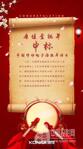 7月20日,中国移动在其招标采购平台发布了集中采购电子海报屏的比选公告。一万六千余台,约1.5个亿的蛋糕,公告一发出,消息迅速在商显行业内扩散,各大公司都摩拳擦掌、垂涎欲滴,纷纷积极响应报名。资格审查、样机测试、投标应答,经过一场激烈角逐的竞争和较量,中国移动最终公布结果——康佳壹视界商显 为本项目的供应商 之一!