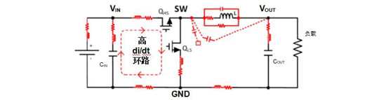 由连接走线包围的区域决定了在此不连续电流的路径中将存在多少寄生电感。公式1表明,流经电感的开关电流会在其两端产生电压差。