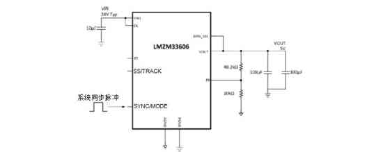 为帮助解决此问题,TI LMZM33603和LMZM33606等电源模块配备了频率同步输入引脚,可使系统中的所有降压稳压器以一个公共频率进行切换。此功能不仅有助于避免拍频,还能将FSW谐波保持在已知频率。接着,设计一个减轻EMI的输入滤波器变得更加容易。图5所示为使用LMZM33606电源模块的典型原理图。