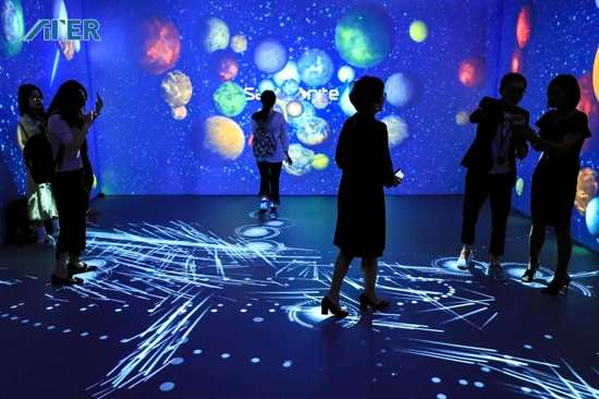 为呼应发布会主题,现场搭建了多通道高清大屏融合仿真系统,三面投影环绕显示覆盖全部视野,大大提高了视觉沉浸效果,再加上人性化的互动功能,让身临其境感更强。优秀的视觉沉浸效果让现场观众仿佛置身宇宙,如同被各“行星”包围,而互动功能则让观众可和“行星”一起行走,在空中划出自己的“行星”轨迹,完美体现设计者的灵感及创意。创意设计和生动的视觉传达方式可彰显品牌精神,点明活动主题思想,活跃活动氛围,还可能给人带来完全不一样的新鲜体验。
