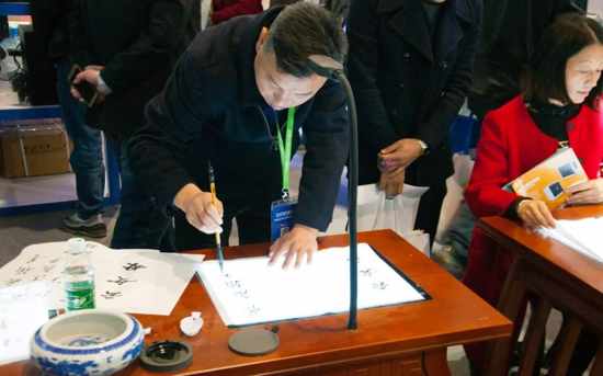 ▲翰墨派书法教学系统成为最受欢迎的展项,众参观者纷纷提笔体验