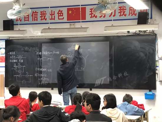 物理课上,老师在黑板上画出了很多重点的电路图,黑板面积显然有些不够,三指熄屏操作关闭智能交互黑板中央屏幕,使得黑板可书写面积更大,电路图再画的大点也完全ok。学生们聚精会神的看着黑板,跟随着老师的讲解认真听讲。