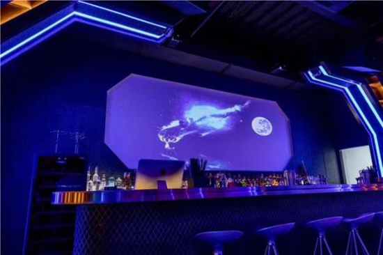 其中最为最炫酷的,是位于吧台的180英寸巨屏。这套由皓空科技为其量身定制的“全息科技”主题酒吧多区域智能投影解决方案,采用2台皓空科技超短焦LED投影仪UP100和1台全景播放盒,在宽4.31米、高1.66米的多边形吧台背景上构建出一幅巨幅外太空画面,让用户仿佛正在亲临一场太空之旅。