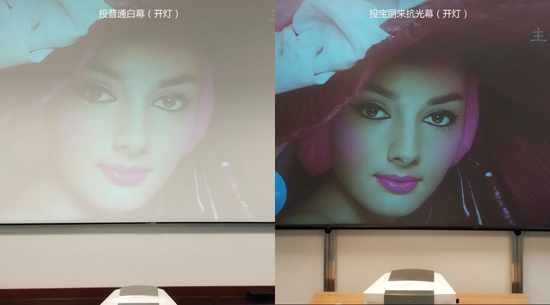 < 开灯投普通白幕与投宝丽来抗光幕对比 >