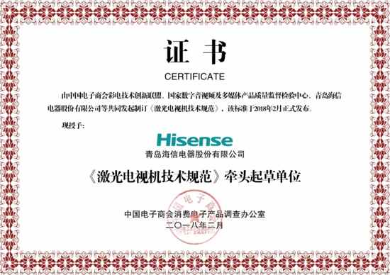 2018年6月25日,海信激光电视产品通过全球最严苛的欧美市场安全认证,同时也通过了国家CCC和美国FDA激光安全认证,光辐射安全等级为RG0(最低光辐射等级,完全无害)。而在北京举办的「海信2018秋季产品品鉴会」上,中国电子技术标准化研究院赛西实验室,正式发布了与北京协和医院的眼科专家联合所做的激光电视和液晶电视的对比评测结果,并向海信颁发了激光电视护眼评测证书。