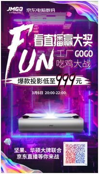 其中,智能投影领先品牌坚果诚意十足地推出了“爆品投影低至999元”的特惠福利,更将在当日晚20:00亮相京东直播,和网友们在线来一场“大屏吃鸡大战”,令人十分期待。