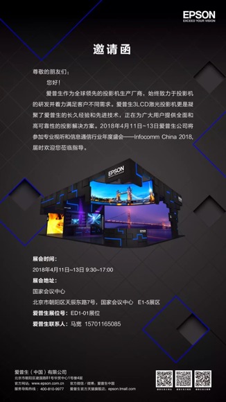 2018年4月11日-13日,专业视听和通信行业年度盛会——Infocomm China 2018将会在北京国家会议中心召开。爱普生将参展本届盛会,邀您一同领略专业投影视听带来的震撼感受。