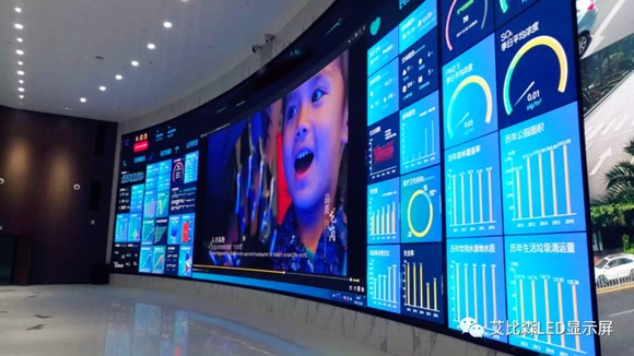 与文博会上不同的是,智慧城市小间距LED屏显示系统整屏面积达166.9平方米,间距低至1.27mm,总像素超过1.03亿点的小间距LED显示屏,超大弧度的精准拼装,将艾比森的显示系统综合设计能力、LED屏生产制造能力和工程服务能力,体现得淋漓尽致。