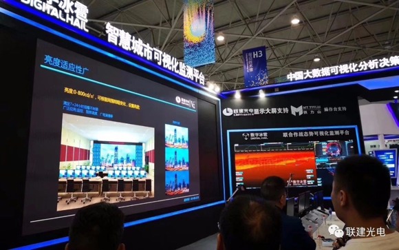 作为LED大屏可视化领域的领头羊,联建光电在现场搭建了一个可视化大数据管理平台,通过表达、建模以及对立体、表面、属性以及动画的显示,对数据加以可视化解释。并现场演绎了智慧城市、工业监控、网络安全、商业监控、航天战场等领域的大数据可视化应用,体验感十足。
