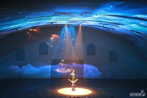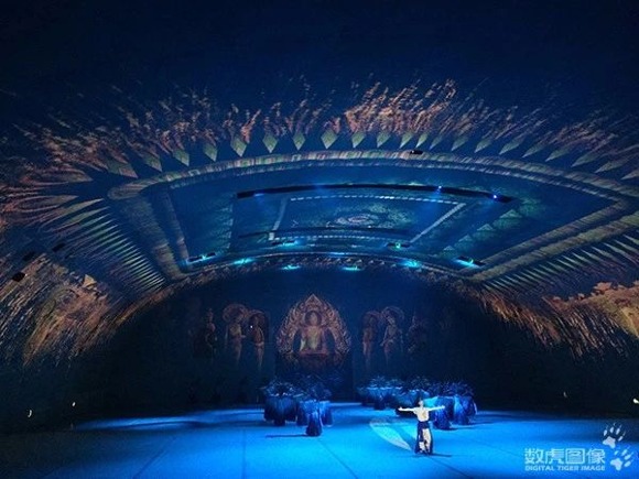 数虎图像以古老的莫高窟壁画、丝绸之路历史为创编素材,创新运用洞窟包裹式全景投影、墙体和穹顶结构投影、水幕投影等多种手段,结合可移动观众席,带领观众穿梭古今。