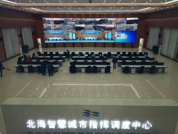 走进北海智慧城市指挥中心,一块120平方米的超大屏幕格外引人瞩目,这块大屏采用洲明16:9标准分辨率小间距LED显示屏UHP1.2点对点无缝拼接而成,可同时播放10个4K或34个1080P画面,每个画面背后都链接着不同的系统以及平台,包括智慧党建平台、智慧城管系统、智慧交通系统、城市安全防控系统等等,是整个北海智慧城市发展的核心与智慧之源。