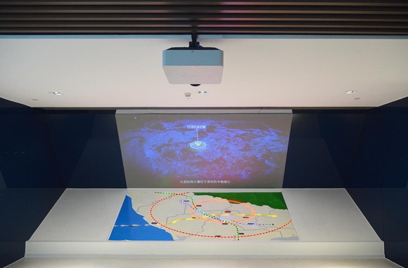 穿过纱幕走廊,我们来到了气势更滂沱的大浪时尚小镇规划展区,首先映入眼帘的方案是1台VPL-F430HZ创造的异形方案,投影画面与灯带地图形成一个向内折角,仿佛一张巨型卡片徐徐打开;展现了小镇卓越的地理位置——地处深圳中轴核心,商业影响力遍及广州、东莞、汕尾等重要城市;灯带地图描绘了陆、海、空立体交通网为小镇带来的区位优势。