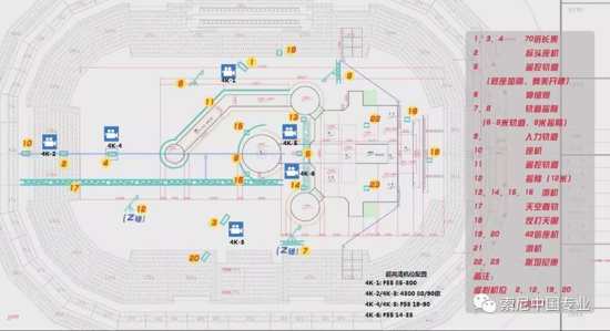 4K制作系统中的1、2、3、4、5号机位分别与高清系统的1、2、3、4、15机位并排放。舞台主面3台107倍大倍率镜头外加1个广角作为主机位,我们在体育转播尤其是足球转播中,主机位的1、2、3号机的镜头可以占整个体育转播画面的百分之八九十以上,反观这次跨年的4K制作,虽与体育转播不同,但是在有限条件下,这样的机位布局也依然能保证一场完整的4K跨年制作。