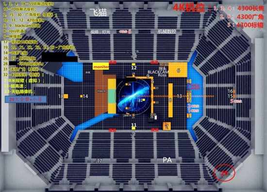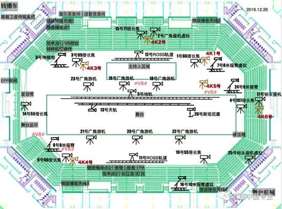 另一方面在舞台上方,架设一条横贯舞台的天轨,同时布置一套蜘蛛系统,机位运动方向与天轨垂直。最后,再加上两台活动的斯坦尼康,对舞台做到了一个全方位立体的覆盖。