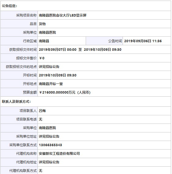 > 南陵县医院会议大厅LED显示屏招标