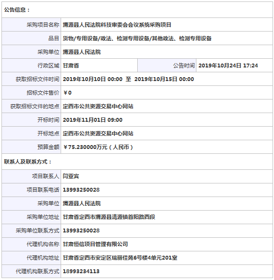 渭源县人民法院科技审委会会议系统采购项目公开招标公告