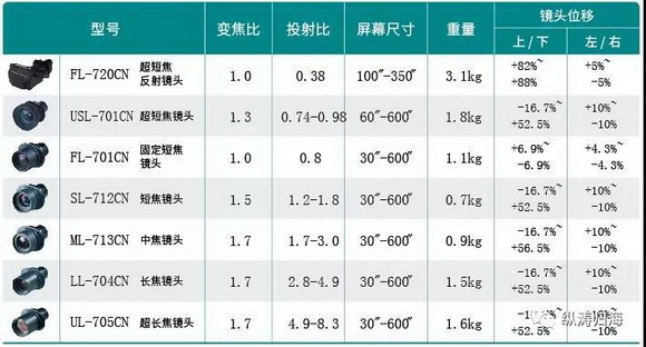 电动镜头位移、变焦和聚焦用遥控器即可轻松实现(各选购镜头支持范围详见左表)大范围的镜头位移功能,让大型场所的投影机安装变得更便捷。