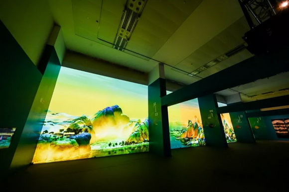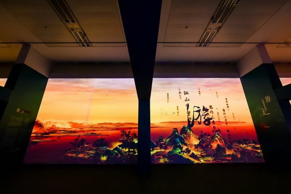 千山叠嶂、万顷碧波分外秀丽壮美,而穿插播放的捕鱼、驶船、行路、游玩等动态视频,将栩栩如生的人物仪态毫厘毕现,静中有动,动中有静,让观众身临其境感受到与壮阔国土相辉映的旷世巨作。