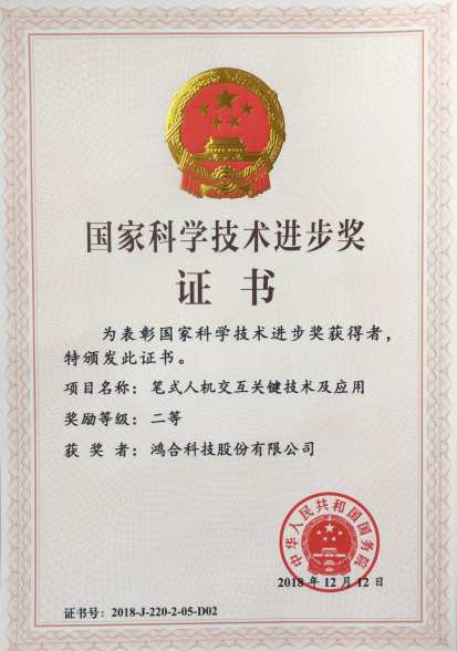 2019年1月8日,2018年度国家科学技术奖励大会在北京人民大会堂隆重举行,由鸿合科技股份有限公司与中国科学院软件研究所等共同主导的“笔式人机交互关键技术及应用”项目,正式获颁“2018年度国家科学技术进步二等奖”。