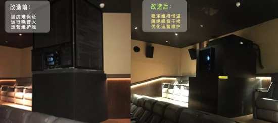 英皇电影城(深圳东海滨纷店)是实力强劲的高端商务影城,建设之初没有完善的无机房放映解决方案,全部采用了简易的安装方案,仅在放映机周围安装了百叶窗和隔音板的吊装架,其温度维持,运营维护,和机器运行噪音都令英皇人头疼不已。