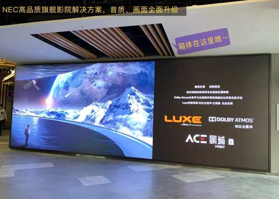 全部采用NEC激光放映机打造全激光影城,是周围最豪华的影城。ACE无机房影厅放映解放方案非常特殊,将NEC恒温箱体安装在影厅之外,不仅最大化地节省用地空间,也给观众提供了极致化的观影体验。