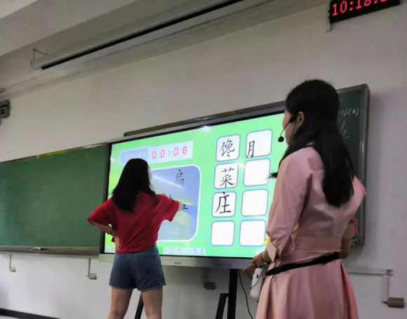 曹燕老师结合自身信息化教学经验,向现场老师分享了使用备授课工具——希沃白板的心得技巧。希沃白板集备授课于一体,以其丰富的学科资源、多样的课件功能、有趣的课堂活动,帮助教师备授课减负,还大大地提高了课堂效率,点燃课堂氛围。接着,曹老师邀请现场的老师上台进行互动体验,亲自操作克隆、放大、拖曳,引发现场阵阵好奇。