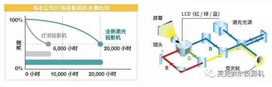※ 该图表仅用于说明目的,对比对象为寿命是 6,000 小时的灯泡投影机。同时亮度衰减曲线仅为示意,不代表机器本身真实衰减幅度。