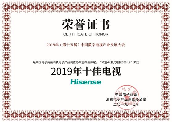 7月2日,由中国电子商会、中国电子技术标准化研究院联合主办的“2019年中国数字电视产业发展大会”在北京举行。根据会上发布的《2019年1-6月中国彩电消费及下半年市场趋势预测报告》,海信等国产品牌继续保持中国彩电消费市场份额核心,并在新型显示技术推广应用方面一路领先。海信荣获“2019年消费者喜爱的电视品牌”,海信激光电视100L7凭借双色超高画质表现、舒适护眼的独有优势、以及强大的人工智能交互功能荣获“2019年十佳电视”。