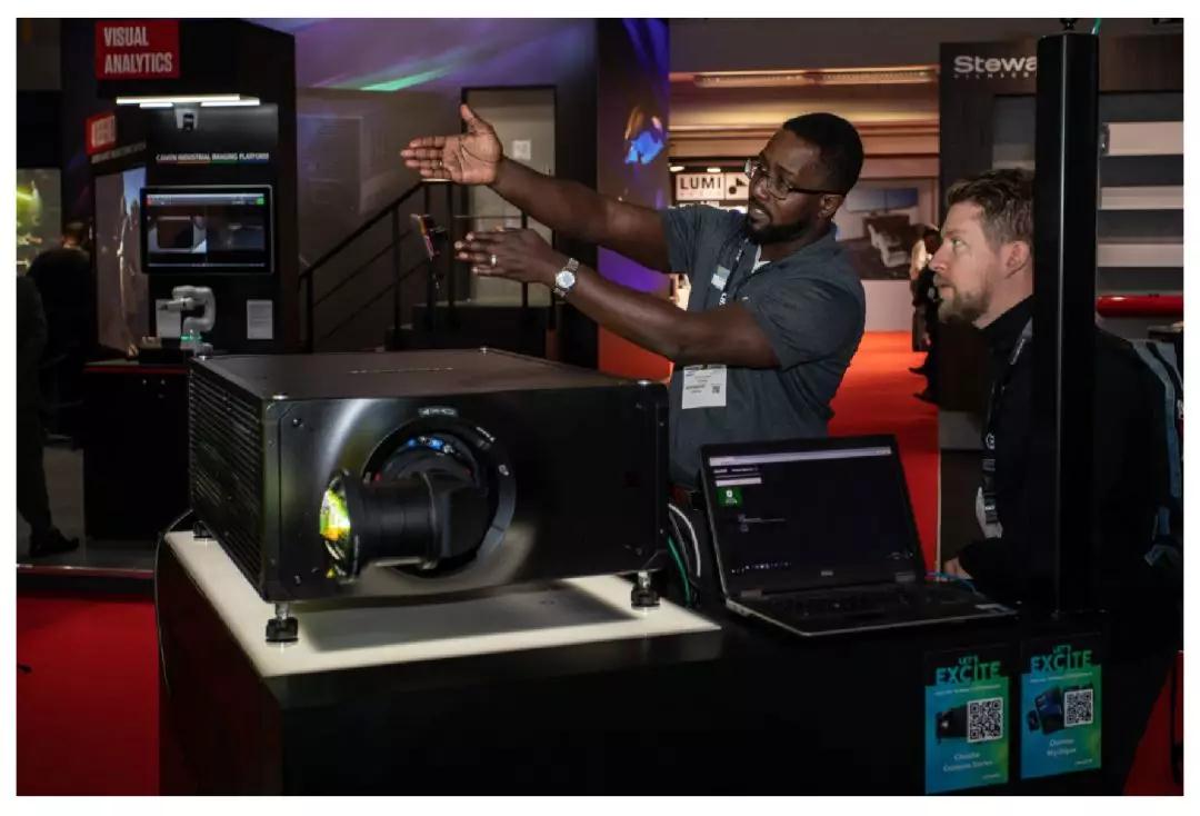 展位动用一台 Crimson 31 作为源投影机,充分展示了 Guardian 的神奇所在(Mystique 的可选功能)。当投影的图像因投影机被碰撞移动产生偏移,Guardian 无需打断观看便可重新对齐画面。