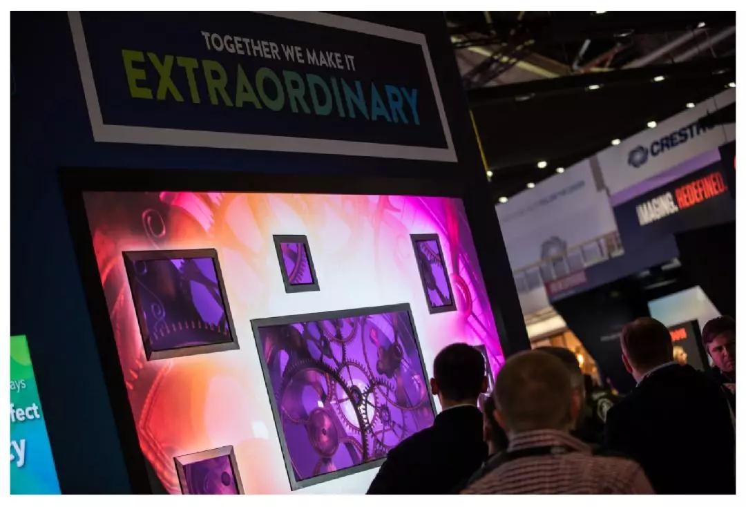 科视身影遍布 ISE 展厅现场。作为 SDVoE 联盟创始成员之一,科视非常乐于为其展位提供 2x2 阵列的 65 英寸拼接式液晶面板,用于展示教育课程视频。另外,AV Nation 在 5x2 显示屏幕(BK019)中使用科视的Apex Velvet 1.2mm LED,且科视投影机还应用于 Tempest(15-K225)、SY Electronics(5-R93)、Screenint(5-T60)和 Legrand(2-C50),Legrand的投影屏幕则在 Christie 展位上使用。