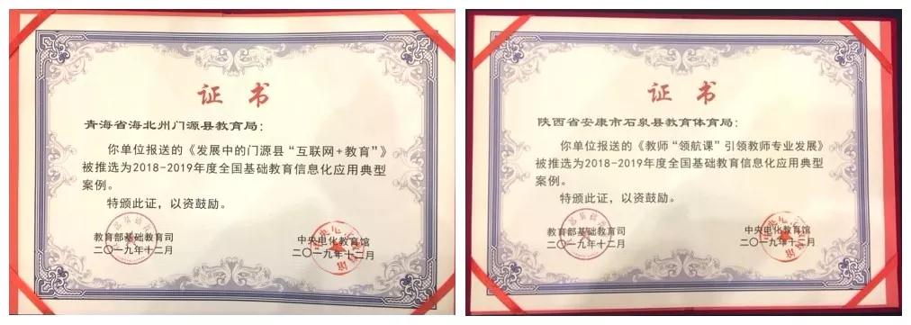 左图为青海省北州门源县《“互联网+教育”》案例获奖证书