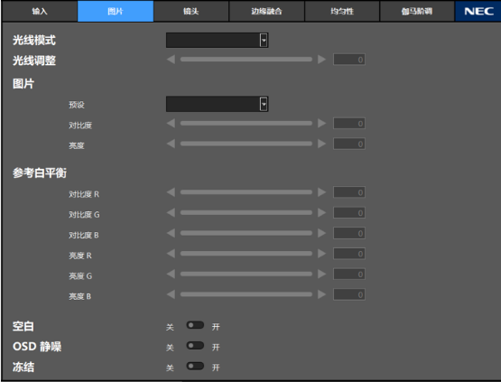 PX2000UL+支持远程、精准地对图像进行优化和细节调校,例如在白平衡方面,可以将对比度R、G、B和亮度R、G、B这6个选项分别进行拖动调整或精确数值输入调整,极大增加了画面调校的精确度。