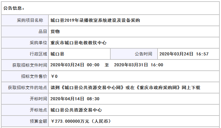 城口县2019年录播教室系统建设及设备采购(19A1018)采购公告