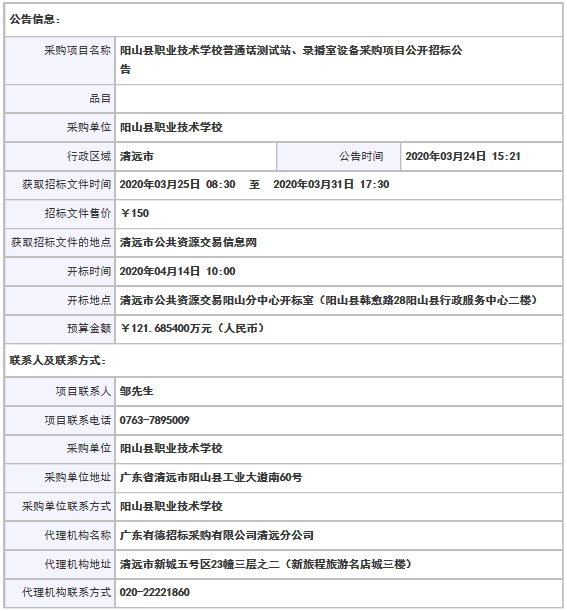阳山县职业技术学校普通话测试站、录播室设备采购项目公开招标公告