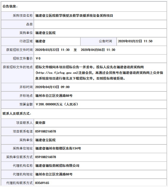 福建省立医院教学模型及教学录播系统设备采购项目招标公告